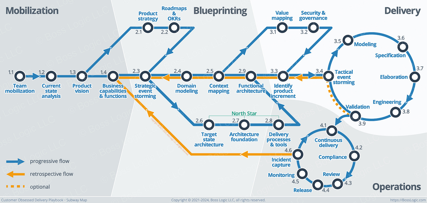 For example, if you are at the “strategic event storming” subway stop, the map shows us that you’ll need a product vision, roadmaps, and OKRs before proceeding. It also shows that the next activity will be either domain modeling or target state architecture. (In fact, you can parallelize and do both at the same time).