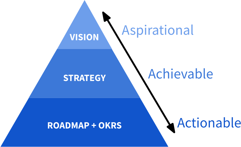 The vision statement is aspirational and, accordingly, very high level. Now we start to make that vision achievable by developing a product strategy. In this activity, we determine the best strategy to successfully deliver objectives that fit our vision. Only after we have that can we move on to the actions that constitute delivery.