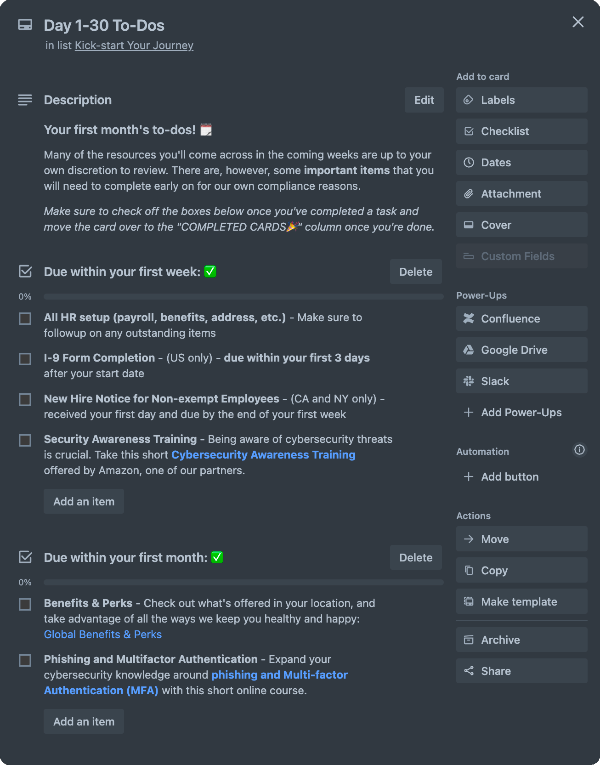 For example, here’s the “Day 1-30 To-Dos” card, which outlines actions your new joiner will likely need to finish early on. Once you’ve copied the template, you can quickly add, change or delete anything you like: