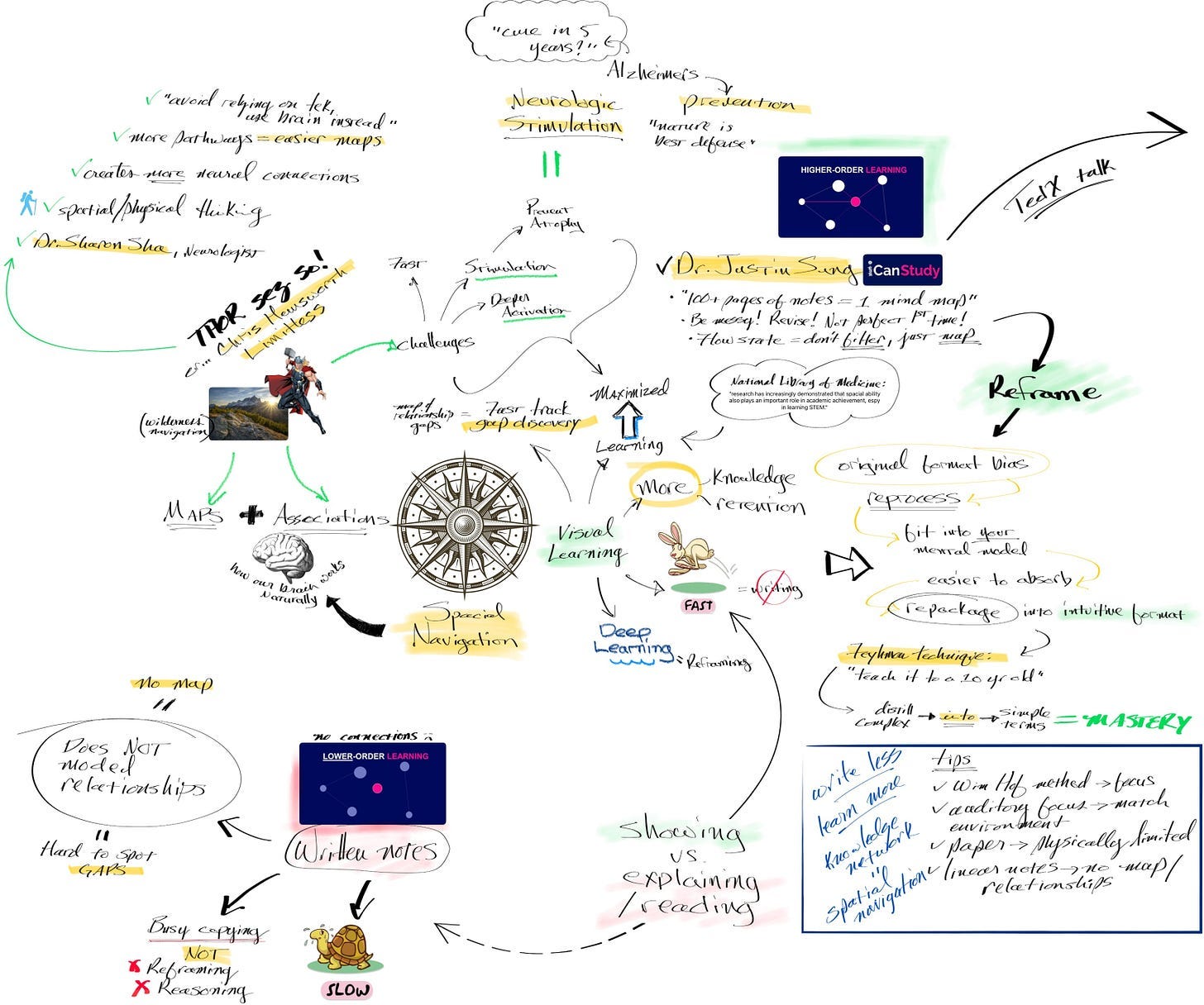 Shifting from a predominantly text-based method of learning to a visual technique lets our brain organize information more naturally. The part of our brain that connects things — visually, spatially — kicks into high gear. We start seeing associations more easily. The “visual map” helps us navigate our collected facts instinctively.