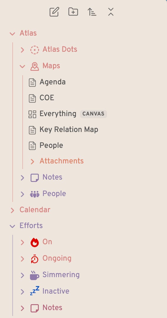 And then Efforts, which is where I put long-running projects that I need to organize. This is for client projects, my Customer Obsessed Engineering (COE) folder, really anything that falls into the category of a focused, specific, ongoing effort that deserves a home of its own.