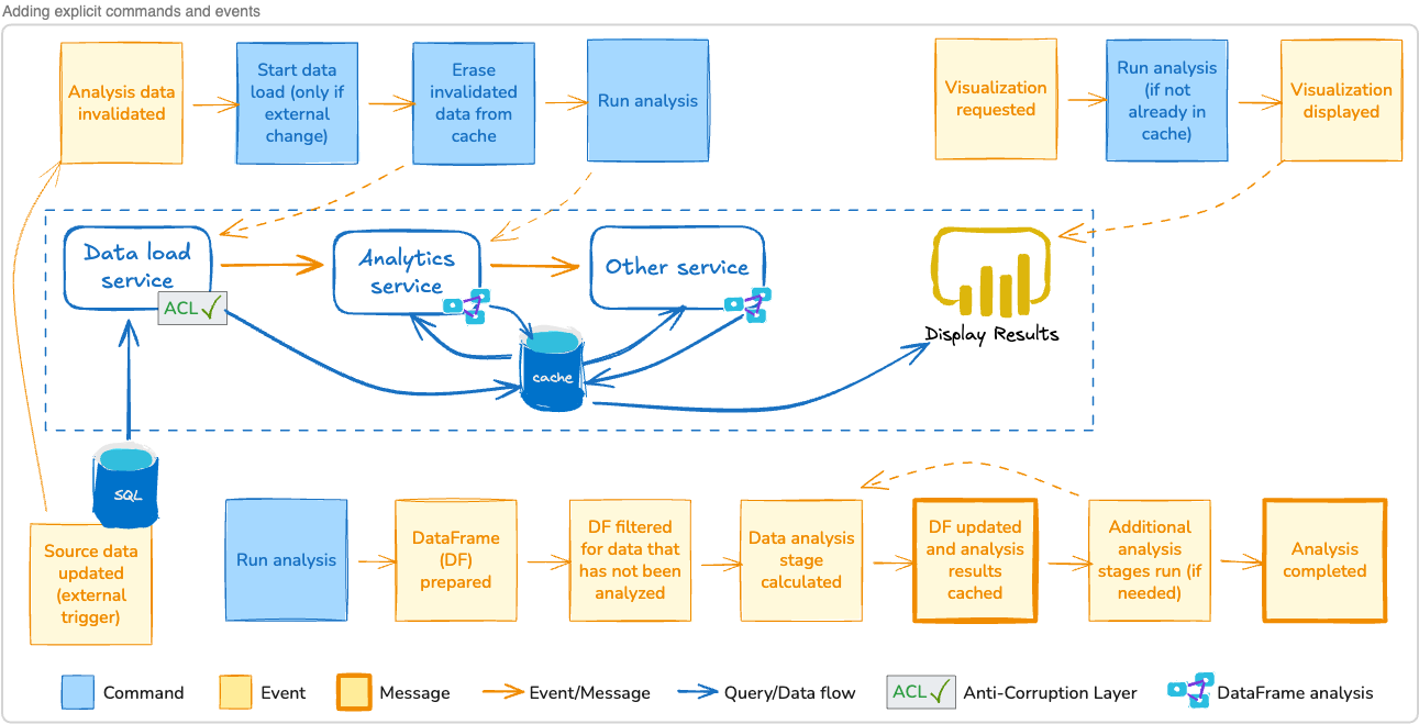 Here’s an updated architectural drawing showing how our events and commands interact with the system: